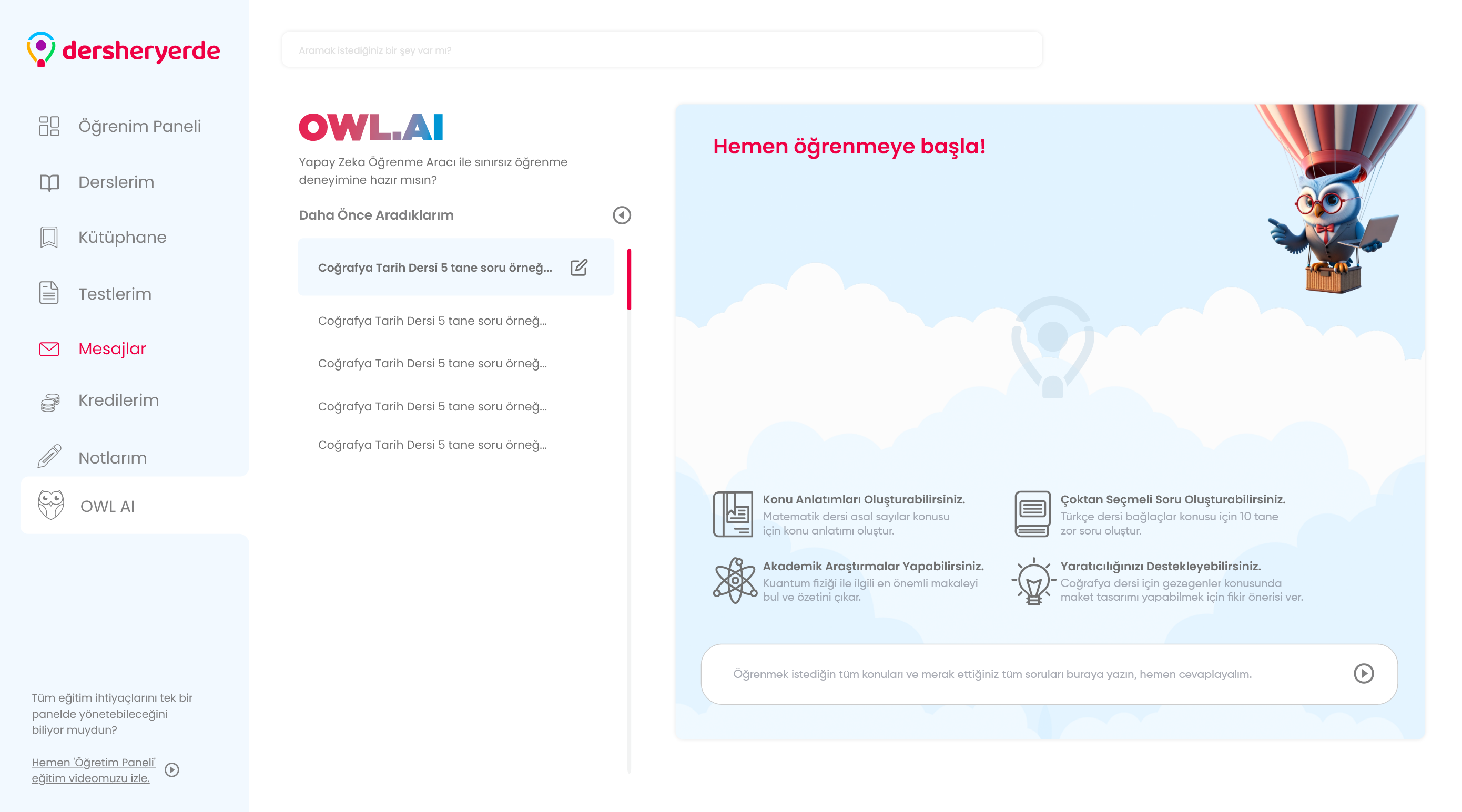dersheryerde.com adresinde yayınlanan ve eğitim dikeyinde geliştirilen OWL AI adlı yapay zeka aracı ile eğitim ve öğretim ortamlarınızdaki verimliliği maksimuma çıkartabilirsiniz. Bunun için dersheryerde.com dijital eğitim platformu içerisinde ücretsiz olarak yayınlanan OWL AI yapay zeka öğrenme aracını inceleyebilirsiniz. Öğretmenler ve öğrenciler için çeşitli eğitim öğretim faaliyetlerine destek olmak amacıyla yayınlanan OWL AI, ilk sürümü itibariyle kullanıcılarına yazı odaklı cevaplar ve promptlar yazmasına imkan tanıyor.